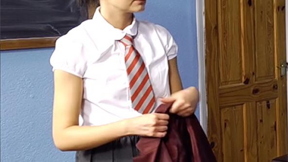 The girls have been called to report to Miss Svenson and Miss Mathews to discuss their essays. Diana timidly enters the room to find a hard punishment waiting for her. Miss Mathews gives her a sharp, stingy hand tawsing, whilst the lazy schoolgirl winces in pain. Next, Miss Svenson flexes her cane before bending poor Diana over the desk, pulling down her knickers for six of the best on her shapely young bottom. Part 2 of 6