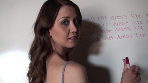 Pretty Chrissy Marie has the athletic body of a dancer. Tall slender, round and shapely in all the right places, her body is a common distraction at school. She often dresses provocatively to work out for P.E. Dressed in a skimpy thong bodysuit and sheer mesh gym shorts leaving a little to the imagination. Her nipples are clearly visible, her heavy breasts exposed at the sides. The top of her thong, the swell of her hips, round bottom peeking out from her shorts, all causing uproar in PE class. She is sent to detention to write "I will not dress like a slut on the board." The principal stops by to further attend to her unacceptable attire. She is hauled over his knee for a spanking on her thin shorts.