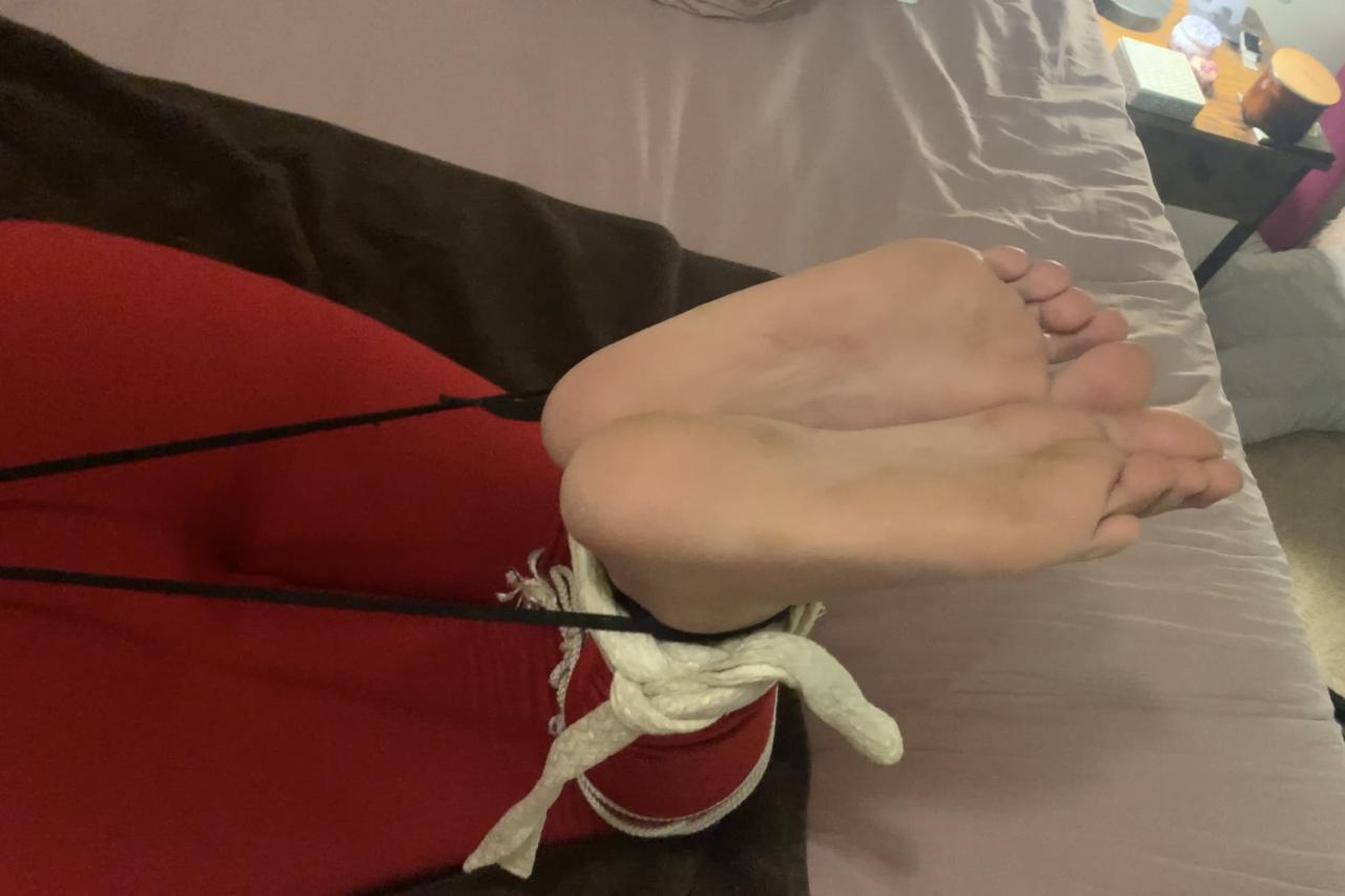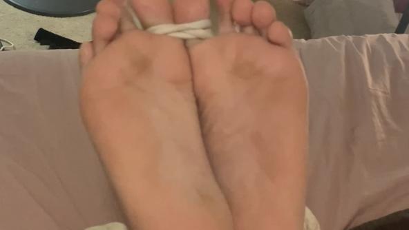Ashley starts the clip in her flats and a handcuff hog tie, while also having her knees and ankles bound. This was her first session since being punished for not draining her master in the previous session, so you could understand how she was a little nervous. Her flats are removed, leaving her sweaty size 8.5 Ebony soles ready to be whipped and punished. She’s warmed up with the leather flogger for about a minute before her master switches to the more painful thin leather whip to beat her slave soles with. Ashley is punished for about 2 and a half minutes non stop and each passing stroke makes her let out groans from the whip stinging her Ebony feet. She’s made to keep them in position and does a good job, knowing that if she disappoints her master a much harsher punishment will follow. For the next set of strokes, I tie Ashley’s two big toes together so that she can’t move her feet away from the beatings that are being given to her soles. As we near the end of the session I switch angles and my slave Ashley begins to count her strokes out loud while thanking her master after each one. You also get a good look at some of the burn marks on Ashley’s slave feet. Her size 8.5 Ebony soles bare the marks of being used for her masters ash tray. Ashley struggles with the punishment but keeps her feet in position for the entire session. After 20 strokes with Ashley thanking me after each one I allow her a short break. Ashley takes it upon her self to continue the Thank you’s to her master but switches up and adds “these feet belong to you” after each stroke. Her master has his way with her feet the rest of the session in what is one of Ashley’s best performances to date!
