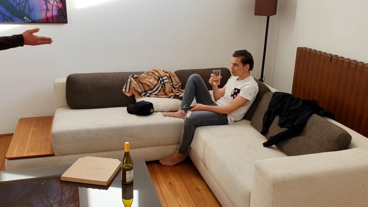 Sergio is sat there in the middle of a mess, clothes all over the place, he is drinking and watching TV without a care. Unfortunately for him Teodor has different views on these things and a great way of making the difference memorable. In short order Sergio is OTK and being paddled. He knows he has done wrong and is resigned to the situation, strange it never occurs to him to change his ways though. Jeans and underwear get a set before his bare ass is paddled thoroughly.