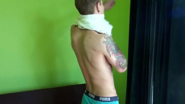 Ricky gets to his room after his OTK session and strips off and stands naked waiting to see what is going to happen. When things start he is OTK again but this time for the paddle. His cute little butt gets a good walloping and starts to colour up nicely. Rickys face is a picture as his rear end gets the paddle treatment. But he is in for a shock as he is told to change position into the wheelbarrow and the spanking switches between the hand and the paddle, so even when he looks round - as he always does - he is not sure which is going to crack down on his ass. His struggling means he has to be held in place by his junk. A super paddling clip with Ricky