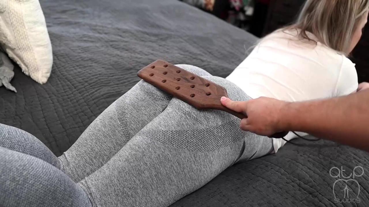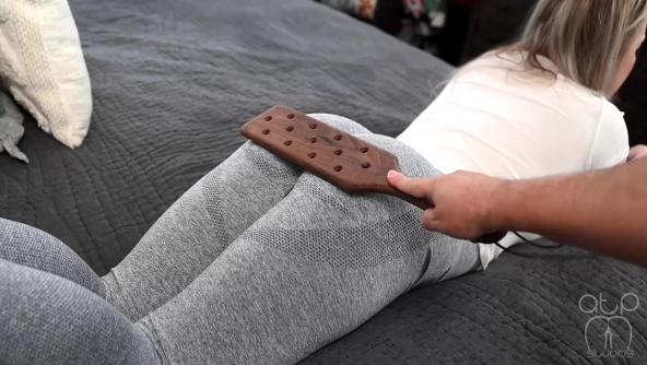 Giggling as a paddle is broken across her exuberant, bouncing bottom, Stevie watches curiously as he selects the thickest paddle. A massive one inch thick Jokari style paddle is tested across her cheeks. The burn of thick wood is immediate through the thin fabric of her yoga pants. Stevie moans, clenching, but never failing to push her bottom up for every swat. Good girls take their spankings and she knows they are celebrating her progress with a well spanked bottom. Splat, followed by whimpers, her bottom is thoroughly paddled. Raising the heavy paddle high, her round cheeks flatten as the fire builds for a solid 5 minutes. Pausing to check the heat rising from her bottom, and between her legs, two additional heavy paddles are used to soundly beat her bottom. Stevie basks in the throbbing burn of wood applied non stop to her eager backside. Pausing to pull her shirt off, her spanking resumes. An impressive no-nonsense paddling lasts almost 10 minutes of spanking the prettiest bottom you've ever seen. Booty Cam angle catches every jiggling moaning swat, with just enough angle to enjoy her bare breasts and pretty face. STEVIE ROSE. BUBBLE BUTT, PADDLING, YOGA PANTS, TOPLESS, BLONDE, DOMESTIC DISCIPLINE