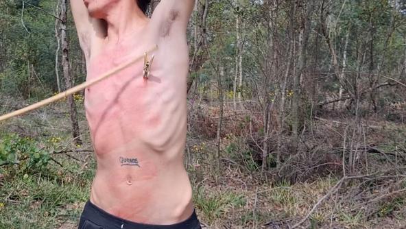 Tim gets a great session with an upper body flogging. But then there is more when the pegs are attached to his nipples and knocked off with the cane. The look on his face is priceless.