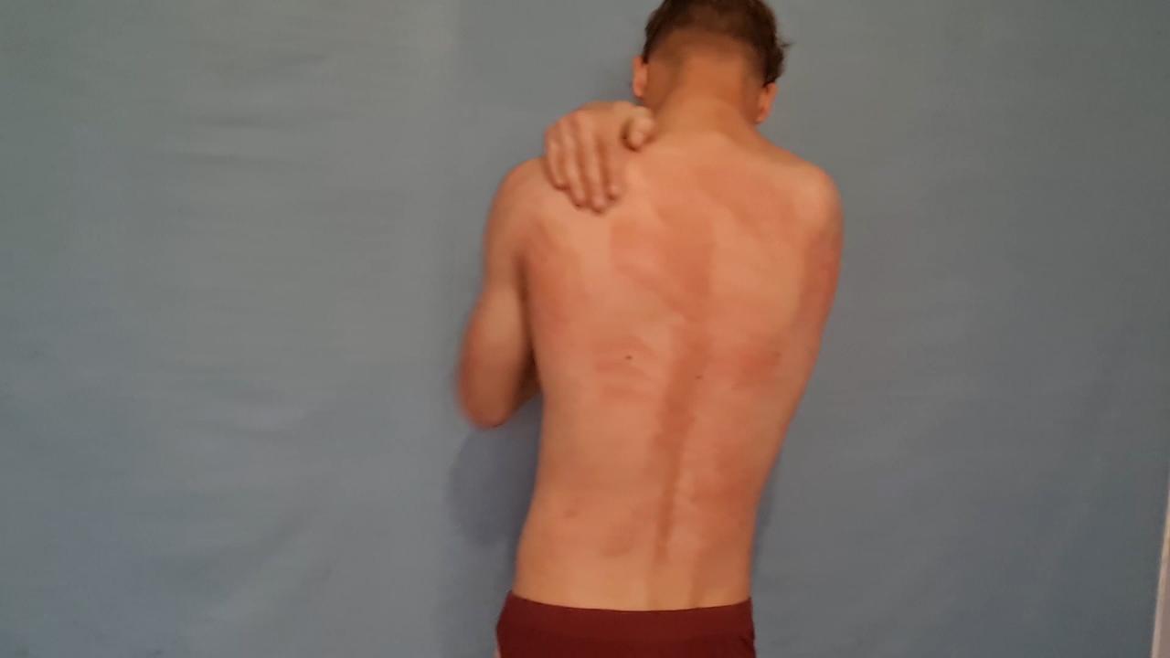 Pieter needs a lesson and the best way to do this is with the martinet. Standing there in his underwear he gets a super flogging all round. There are some lovely welts on him by the end of the session, and the way he gently rubs them says they are really sore, as they should be. A great clip with Pieter
