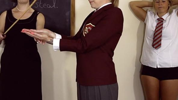 Rebecca, Dorothy and Vanessa have been stealing from the corner shop. After a sharp scolding from Miss Mathews, one by one, the girls raise their arms for a hard caning on their thieving little hands. Stripped out of their skirts, the girls huddle in the corner, nursing their sore palms whilst they await their next punishment. Part 1 of 12