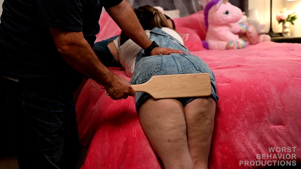 Kiki and Dolly continue to argue even as they are bent over separate edges of the bed. The paddle soon has them singing a different tune, cracking across short overall covered bottoms. Kiki reaches out to pull Dolly’s hair, getting extra hard swats on the seat of her extra short overalls. The crack of the paddle falls over and over, but it’s not enough for them to stop fighting, yet. Kiki takes an extra hard volley of swats, before Dolly tries to convince him that she is sweet and innocent. “This is the price of bad behavior” The girls are lined up side by side to learn their lesson together. KIKI CALI, DOLLY MATTEL, SPANKING, DOMESTIC DISCIPLINE, STEP SISTERS, PADDLING, OTK PADDLING, SCOLDING