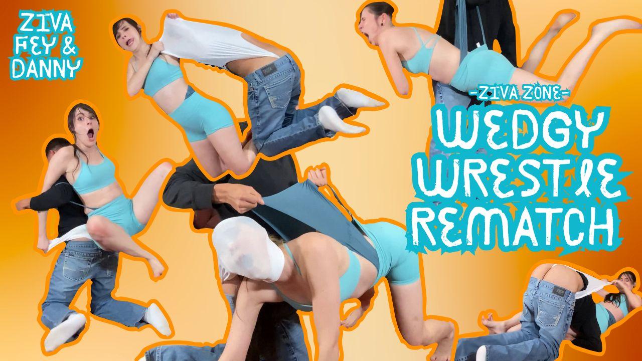 4K/ Ziva Fey has a wrestling wedgy rematch with Danny, Ziva is in her sports bra and sports shorts like the first time and has on stretchy, teal undies. Danny squares up with Ziva in his jeans and black long sleeve with his stretchy cotton undies. The two square up and begin to wrestle. They Engage in a test of strength and instantly start wedging each other. They roll and tussle around, grabbing and putting each other in holds as they wedgy each other, they are each feisty and loud having an intense wrestling wedgy match. They each moan, scream and squeal in pain, laughing as each other floss, pull, and yank the fabric rubbing each other’s ass cracks, raw and red. Who is the winner?
