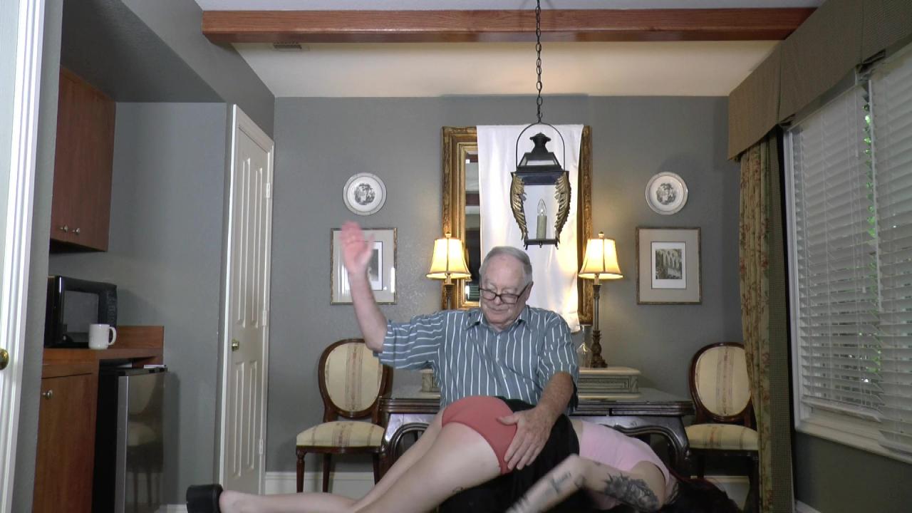 Sassy Cherry Winters, already sore from a spanking and a paddling, now gets another trip across Principal Tubaman's knee, skirt up, for a sound spanking in her skimpy panties.