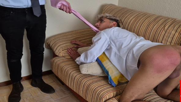 Mike returns to his job as an insurance salesman. He's a bit lazy and can't sell a single policy. Unfortunately for him, he has a very strict team leader. He chooses a humiliating punishment or is fired. Christmas is coming, and he needs the money, so he agrees. It's quite a sight as his backside reddens with each lash. Just when he thinks it's over, he's punished in a particularly humiliating position, completely exposed to his boss. However, his boss isn't so oblivious and ends up soothing his punished bottom with a refreshing cream. Mike vuelve como vendedor de seguros. Es un poco perezoso y no consigue vender ni un seguro. Por desgracia para el y su culo tiene un jefe de equipo muy estricto. O acepta un humillante castigo o es despedido. Viene Navidad y necesita el dinero, asi que acepta. Es un espectáculo como su culo va enrojeciendose azote tras azote. Cuando creía que esto había terminado es castigado en una posición especialmente humillante donde queda totalmente expuesto ante su jefe. Aun así su jefe no es tan despistado y termina calmando su castigado culo con una refrescante crema.