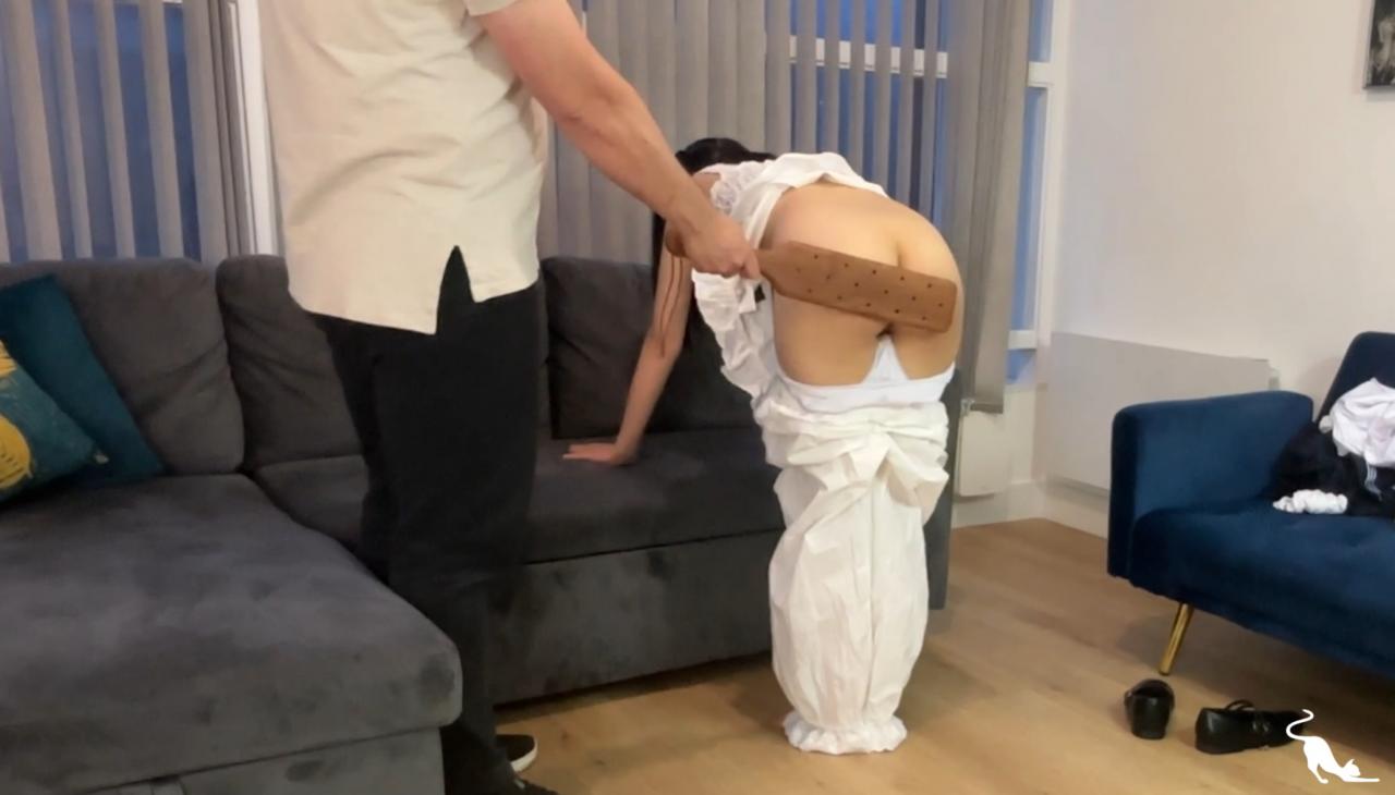 Having been spanked at school for breaking into the staff room, Emma returns home to face even more punishment. Staying at a guardian’s house whilst she is visiting a school overseas, he follows her parent’s strict instructions. If she is punished at school, she will be punished at home. She bends over for a thorough paddling before being sent to bed.
