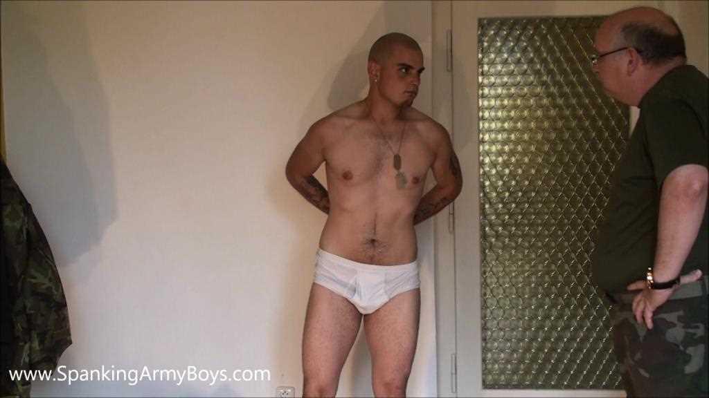 Nick is a new recruit, and the marshal wants to welcome him to the army with a training punishment session. The marshal orders Nick to undress and then he receives a hard spanking by hand over the marshal's knee. And then to see his muscles at work, he must perform physical exercises with push ups on the floor.