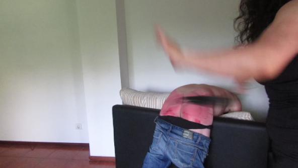 "My husband Mario and I had just had a very enjoyable meal with friends. Unfortunately Mario had a little too much to drink and he made a remark to my friend Carla which I considered inappropriate. I have taught my husband that I will not tolerate him being disrespectful towards women, and the fact that he should do so to my friend means that he has not learned this lesson and that he has disobeyed me.This behaviour must be punished. When we got home I told him straight-away that I was not pleased with him, and he knew why. I told him to drop his trousers and bend over the couch. He knew better than to argue with me. That would have only resulted in a more severe punishment. He has been in this position many times before and he knew what to do. He bent over... I got a selection of my favourite straps, including the green rubber one that give an intense impact, and began his punishment. This is not playtime. This is a real punishment. Sometimes the he could not help trying to cover his backside with his hands to avoid the strokes of my strap. I do not allow this, and whack his hand with the strap until he has removed it and his backside is once again available for its punishment. I pay no heed to his moans and protests, and continue with his severe punishment until I am satisfied that he has learned his lesson."