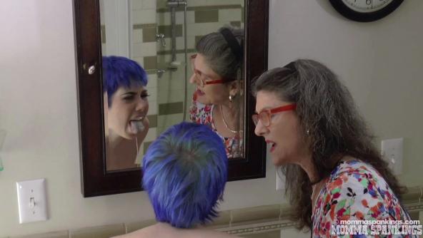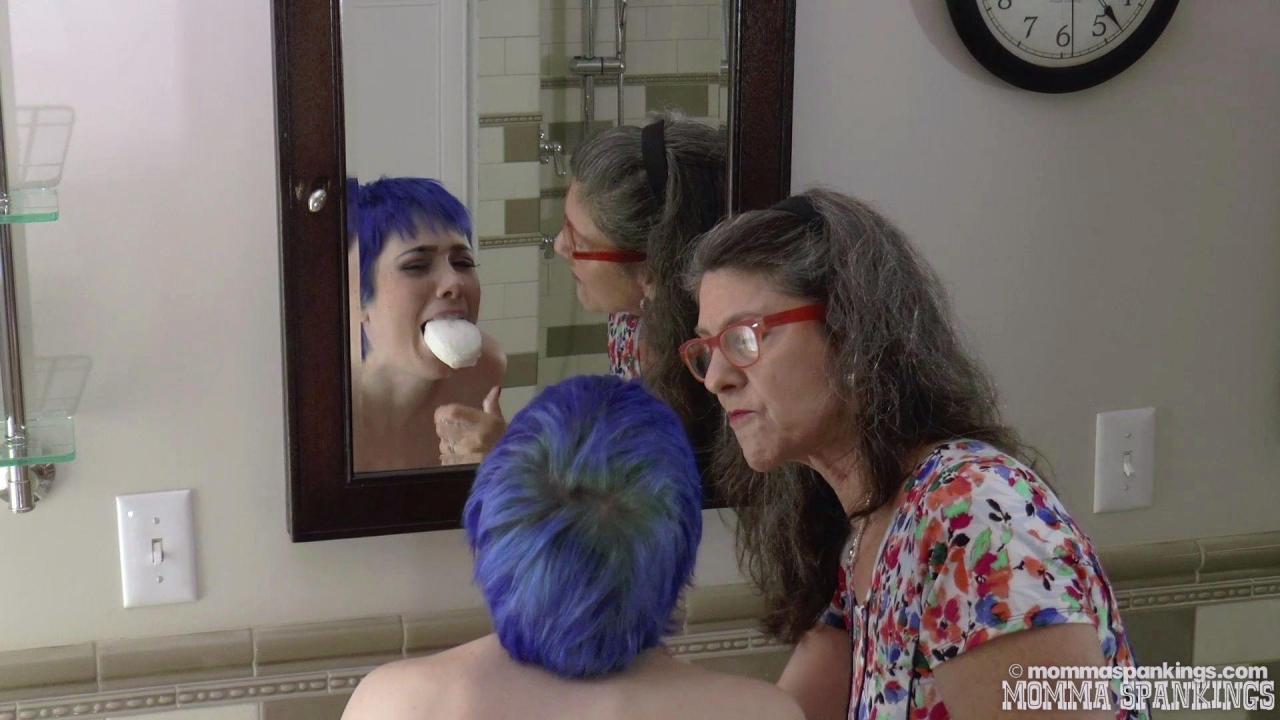 In this long three-part film, Opal has been very rude and disrespectful to mom. She has even gone and dyed her hair blue without asking permission. If she lives under mom's roof, she has to follow the rules, and those who don't get punished. So Opal is taken over the maternal lap for a much-needed spanking. She is spanked over her tight jeans, her white cotton panties, and finally on the bare bottom. Mommy uses her hand and the leather paddle which really turns her bottom a nice shade of crimson. Next, Opal is taken up the stairs, red bottom on display for part two of her punishment. Mommy humiliates Opal by putting her into a diaper. If she is going to act like a little girl she will be treated as one and diapered. Opal is put into a cute Rearz Princess Pink diaper and told to crawl around for further humiliation. The last part of Opal's punishment is a mouth soaping to clean away all her filthy words. She begs and pleads as she hates this type of nasty punishment, but there is no getting out of it now. Opal is given a mean, sudsy mouth soaping while standing in just a diaper which, this time, really teaches her a lesson.