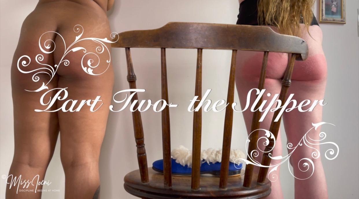 Violet and Denali have been out all night, and on their return, worse for wear, they trashed several gardens, broke flower pots, and woke several neighbours, including the fearsome Miss Iceni, who is very involved in the local neighbourhood protections scheme. Hung over, and regretting their escapade, they are horrified when the doorbell goes, and it turns out to be Miss Iceni, here to offer them a stark choice: Either they pay for their terrible behaviour, or they will face the wrath of the neighbours. She asks where is a suitable room for their punishment to be carried out, then orders her to strip and join her in the other room. Both girls are about to be out across Miss Iceni's knee and given a good, no-nonsense hand spanking, followed by a hard slipper spanking while bent over the back of a chair.