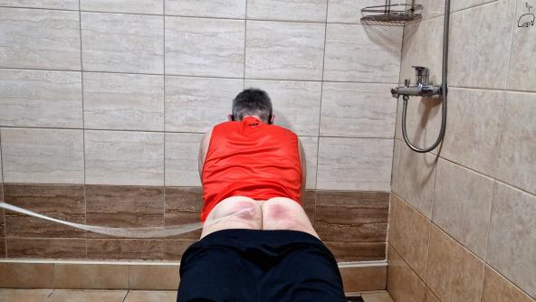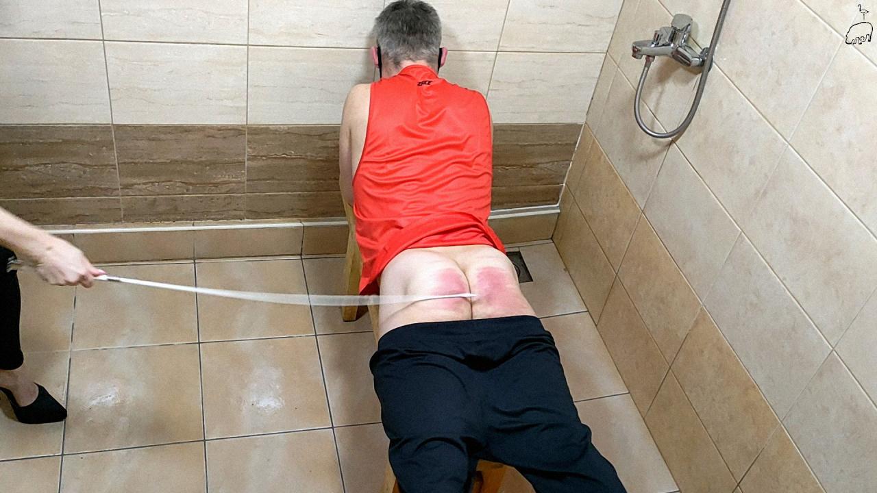 Mistress Flamingo severely spanks her husband with a dressage whip in the bathhouse.