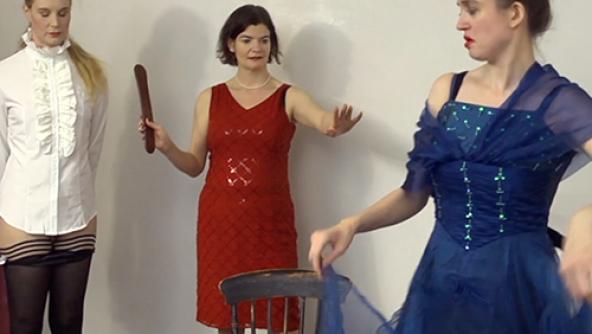 Amelia and Nicola have been chosen to perform in the Christmas Pantomime, and it all goes wrong! Miss Mathews is none too pleased with the girls' lack of preparation, and decides a hard punishment is in order. Nicola takes Amelia's place over the chair, leaning all the way to the floor for a spanking in a very uncomfortable position. Miss Mathews wastes no time reddening the lazy student's bottom, scolding her repeatedly whilst beating her bottom. With her classmate holding her down, poor Nicola takes a hard spanking until her cheeks are thrashed and bruised. Part 4 of 10