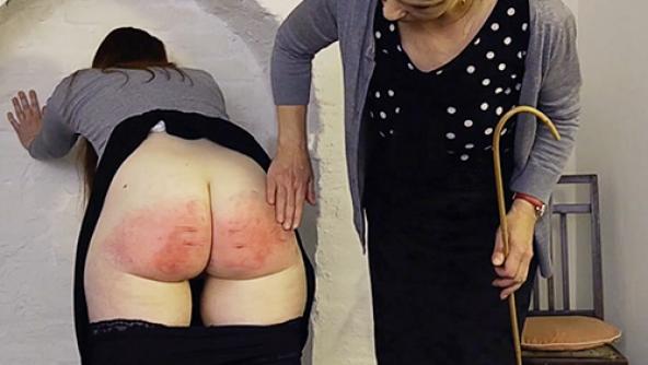 Sitting on a sore raw bottom doesn't seem to have improved Marianne's performance at work! Miss Svenson bends her over, hands on the wall for a long and hard caning. Poor Marianne shivers and sobs in pain, but her punishment continues until her lazy young cheeks are covered in deep red stripes. Finally, Miss Svenson takes her lazy employee over the knee for a sharp scolding and hard hand spanking. Part 5 of 5