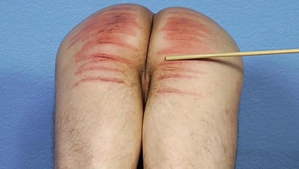Bruno sits at attention, clearly frightened by the sound of my cane slicing through the air. Bent over on his knees, he presents his naughty little bottom for another long and hard caning punishment. Poor Bruno writhes and moans in agony whilst I stripe him mercilessly, over and over, until his bottom is a mess of raw red stripes. Part 4 of 6