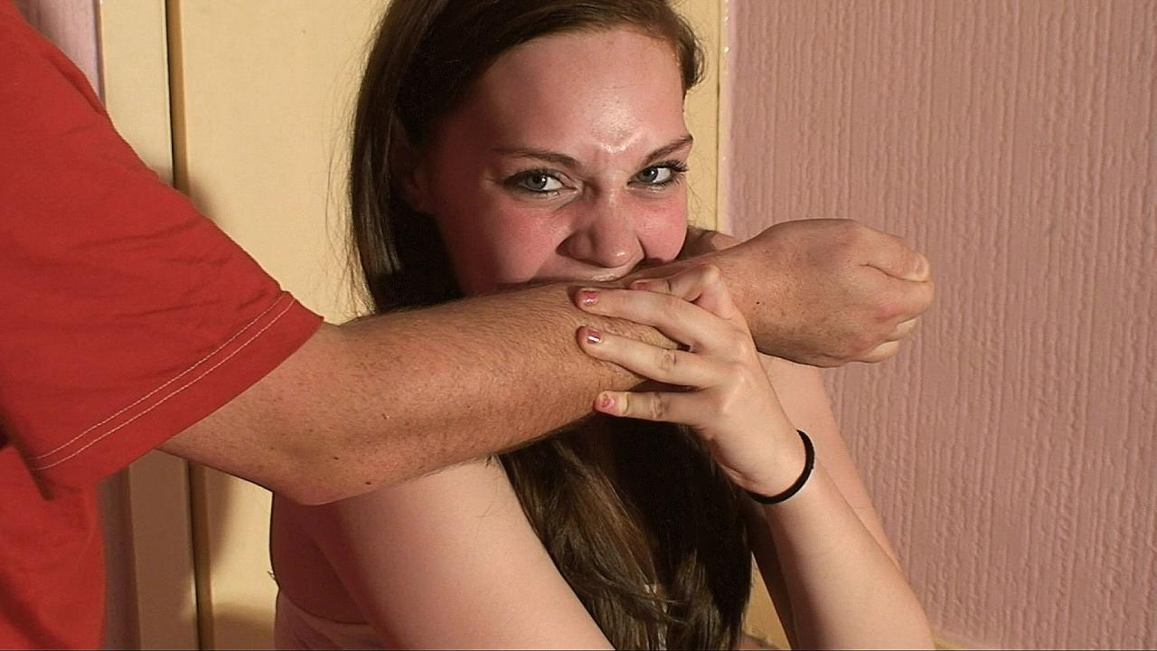 Sophie bites her slaves arms extremely hard sometimes as hard as she can she then bites his fingers and hands this girl is really hurting him, she shows you the damage she did to her victim and then she shows you her teeth after.