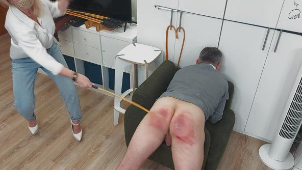 Mistress Flamingo spanks her husband with a cane, whip, and rods on his bare ass. Collection of clips from 2024.