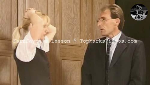 Featuring KaraJayne as the head girl and Colin Tersley as Headmaster Mr. Forder. KaraJayne was left in charge of a class of new pupils but was unable to control them, resulting in the girls shouting, screaming, and disrupting other classes. The headmaster summons her to his office, where she is soundly spanked and strapped. Please note this clip is from the Top Marks Video Archives; the quality is not up to the HD standard of videos produced today. The video "KaraJayne's Lesson" (2002) is a short erotic corporal punishment film written and directed by Cliff James, owner of TopMarksVideos.com